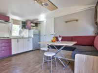 The mobile homes have a surface area of 30 sq.m. (7.5 x 4 m), 2 bedrooms – 1 double bedroom, 1 bedroom with 3 children’s beds, living room, there is a shower room and toilet, plus a fully-equipped kitchen.